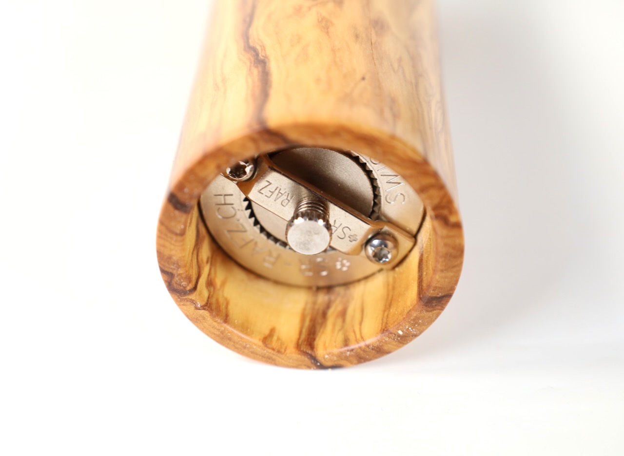 Edle Gewürzmühle aus wunderschönem venezianischem Olivenholz in moderner gerader Form mit besonders ausdrucksstarker Maserung. Die Form ist bewußt schlank und elegant gehalten, das Holz spricht für sich. Das Präzisionsmahlwerk stammt von der Schweizer Firma Strässler und ist sehr langlebig.
