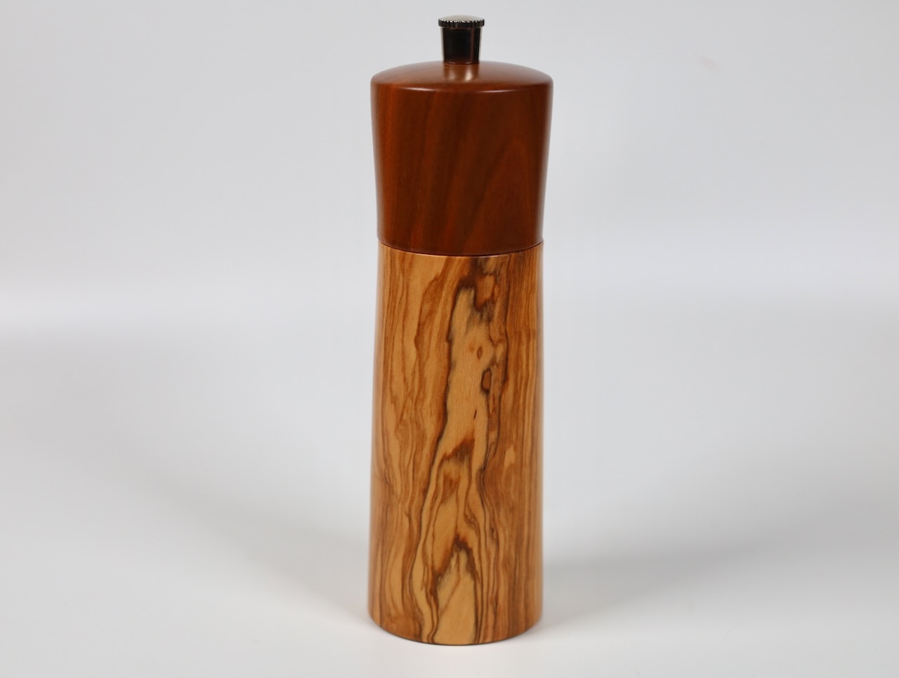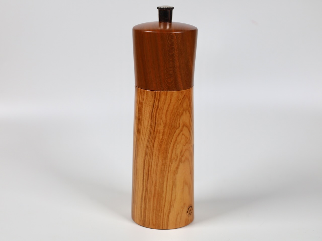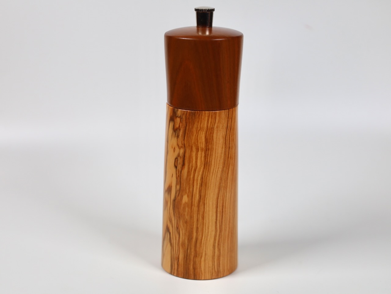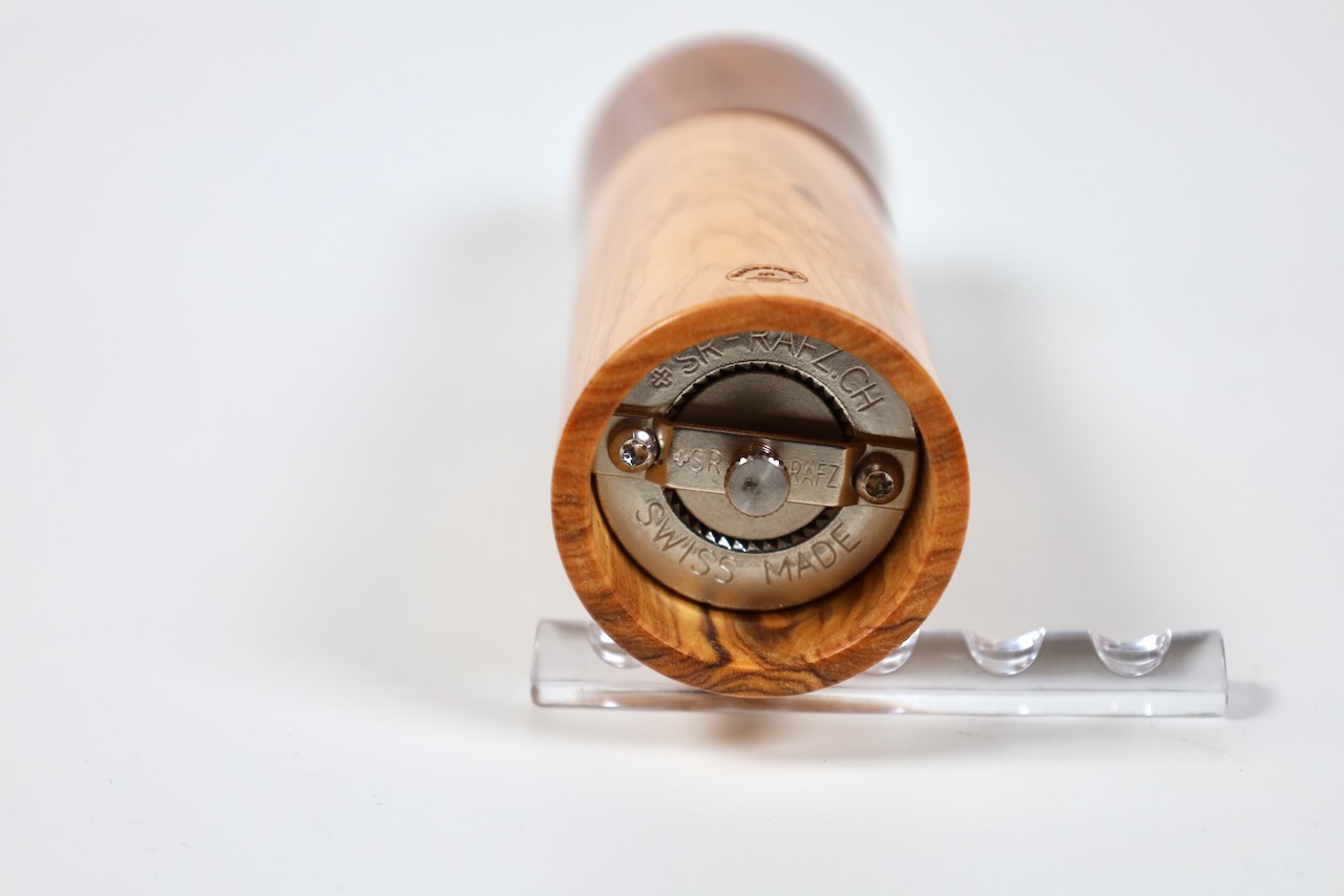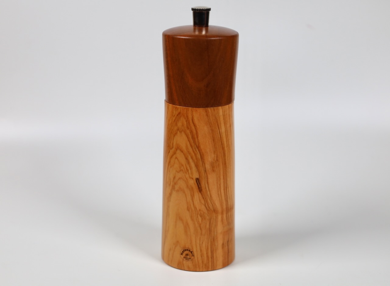 Edle Gewürzmühle aus wunderschönem venezianischem Olivenholz und Zwetschgenholz in moderner gerader Form. Die Form ist bewußt schlank und elegant gehalten, das Holz spricht für sich. Das Präzisionsmahlwerk stammt von der Schweizer Firma Strässler und ist sehr langlebig.