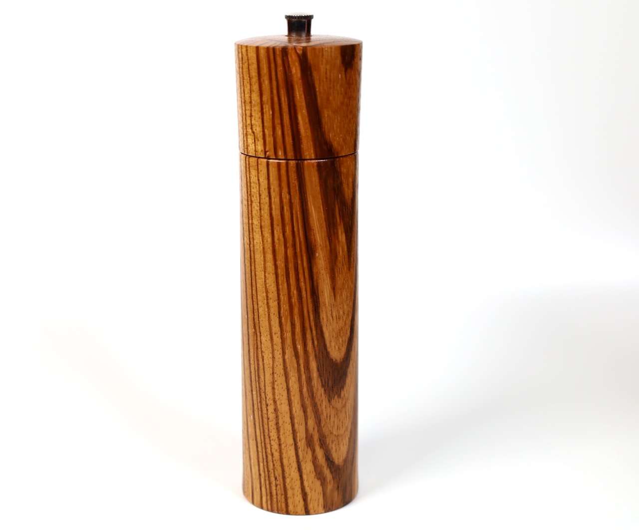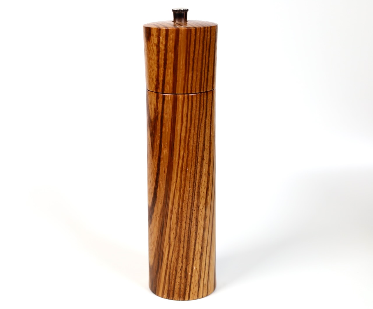 Edle Gewürzmühle aus wunderschönem Zebranoholz in moderner gerader Form. Die Form ist bewußt schlank und elegant gehalten, das Holz spricht für sich. Das Präzisionsmahlwerk stammt von der Schweizer Firma Strässler und ist sehr langlebig.