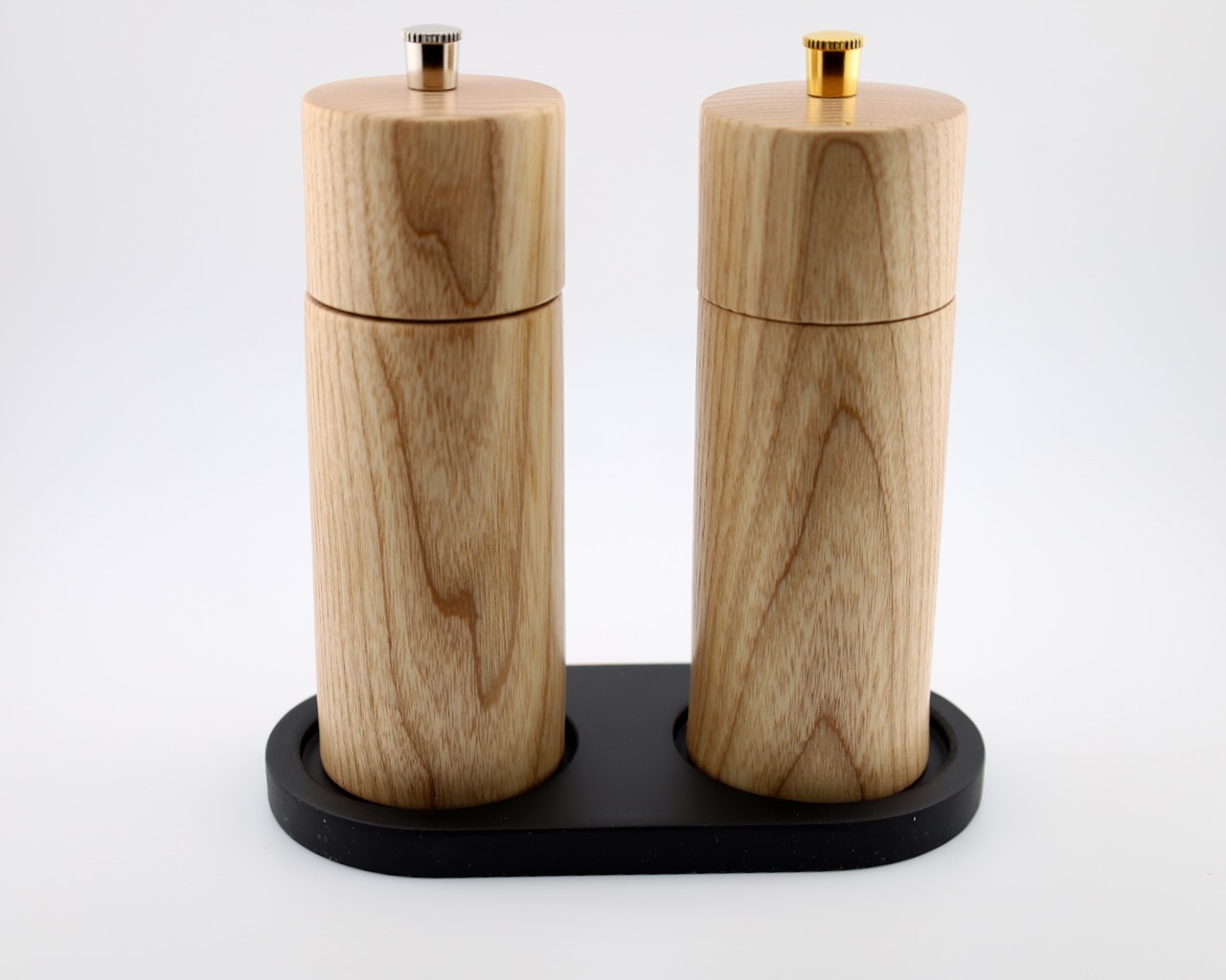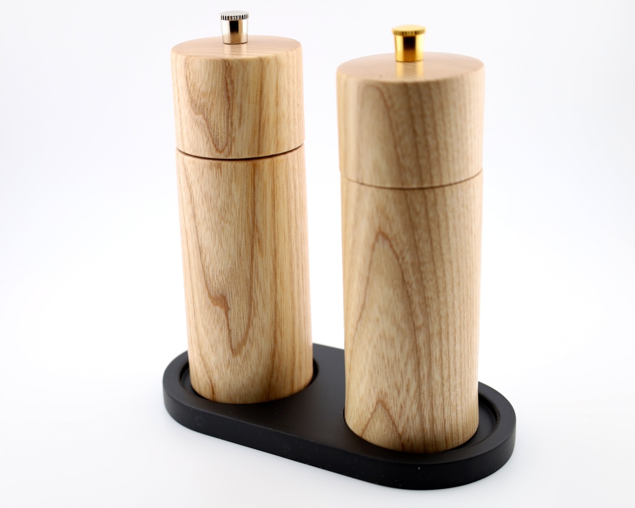 Edles Mühlenset aus Eschenholz mit Schweizer Edelstahlmahlwerk. Sie können selbst wählen, welche Kombination Sie möchten. Bestehend aus zwei Mühlen und einem Mühlenuntersetzer.