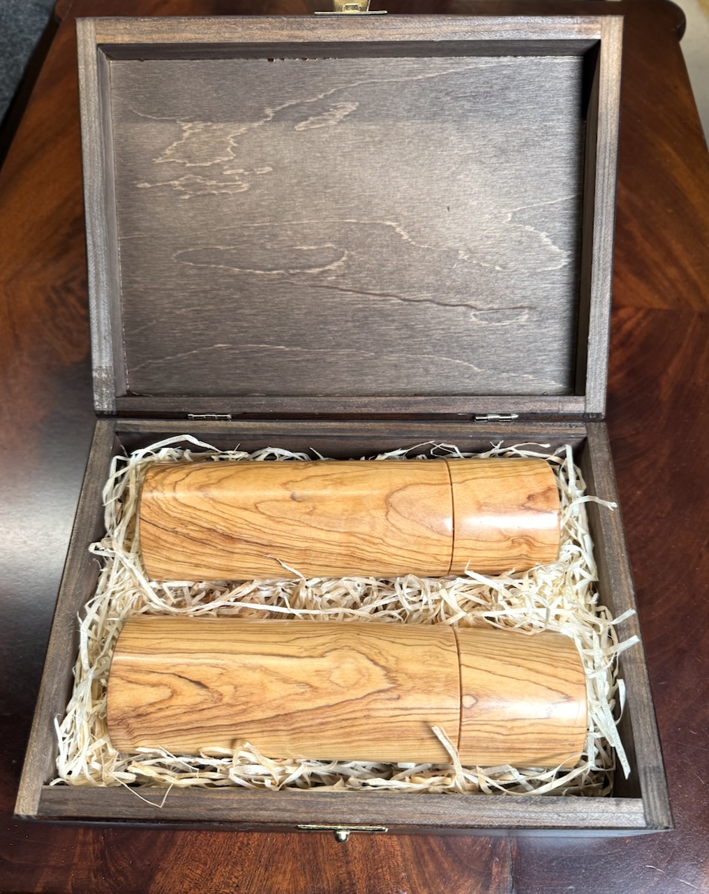 Edles Mühlenset, bestehend aus einer Pfeffermühle und einer Salzmühle aus Olivenholz auf einem Untersetzer aus Olivenholz.