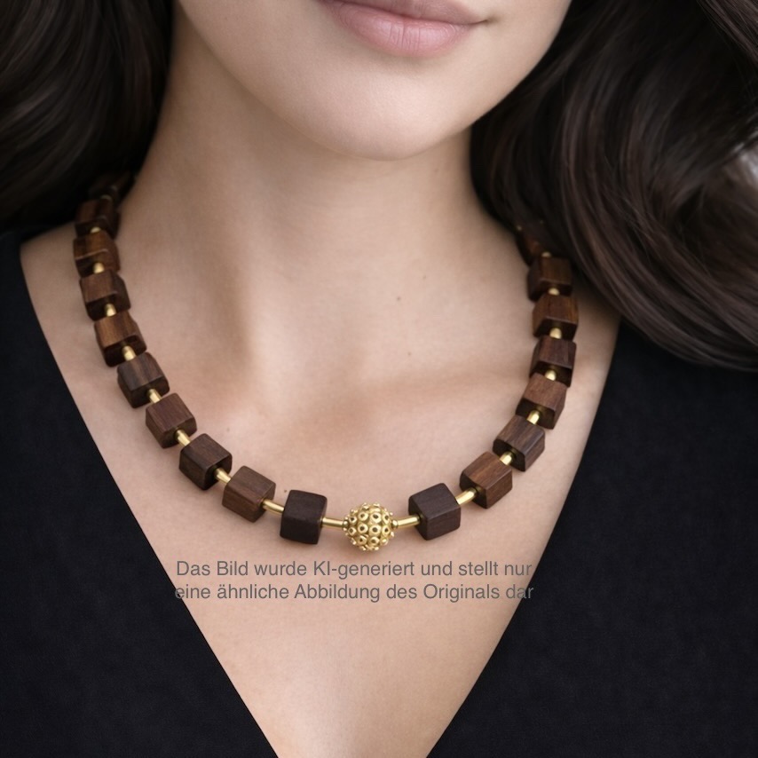 Diese handgefertigte Kette vereint die außergewöhnliche Eleganz von Makassar Ebenholz mit stilvollen Goldakzenten. Das Zusammenspiel aus dunklem Edelholz und warm glänzendem Metall verleiht dem Schmuckstück eine besonders edle und zeitlose Ausstrahlung.