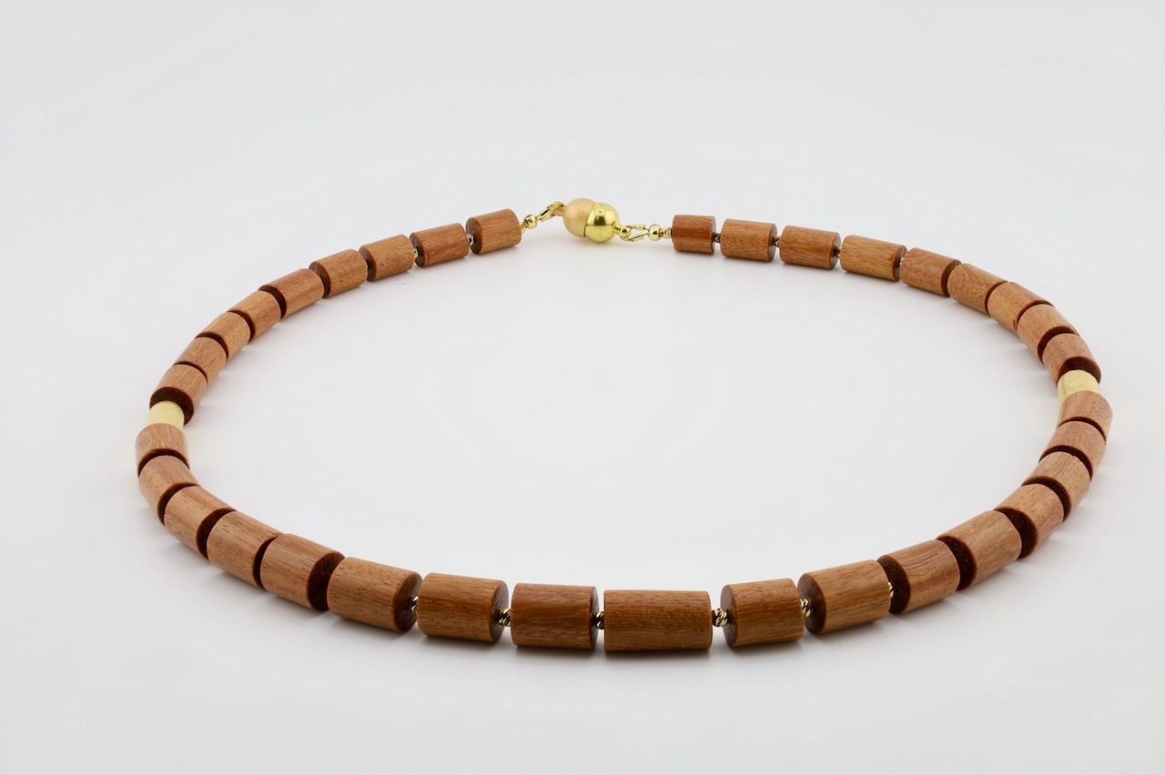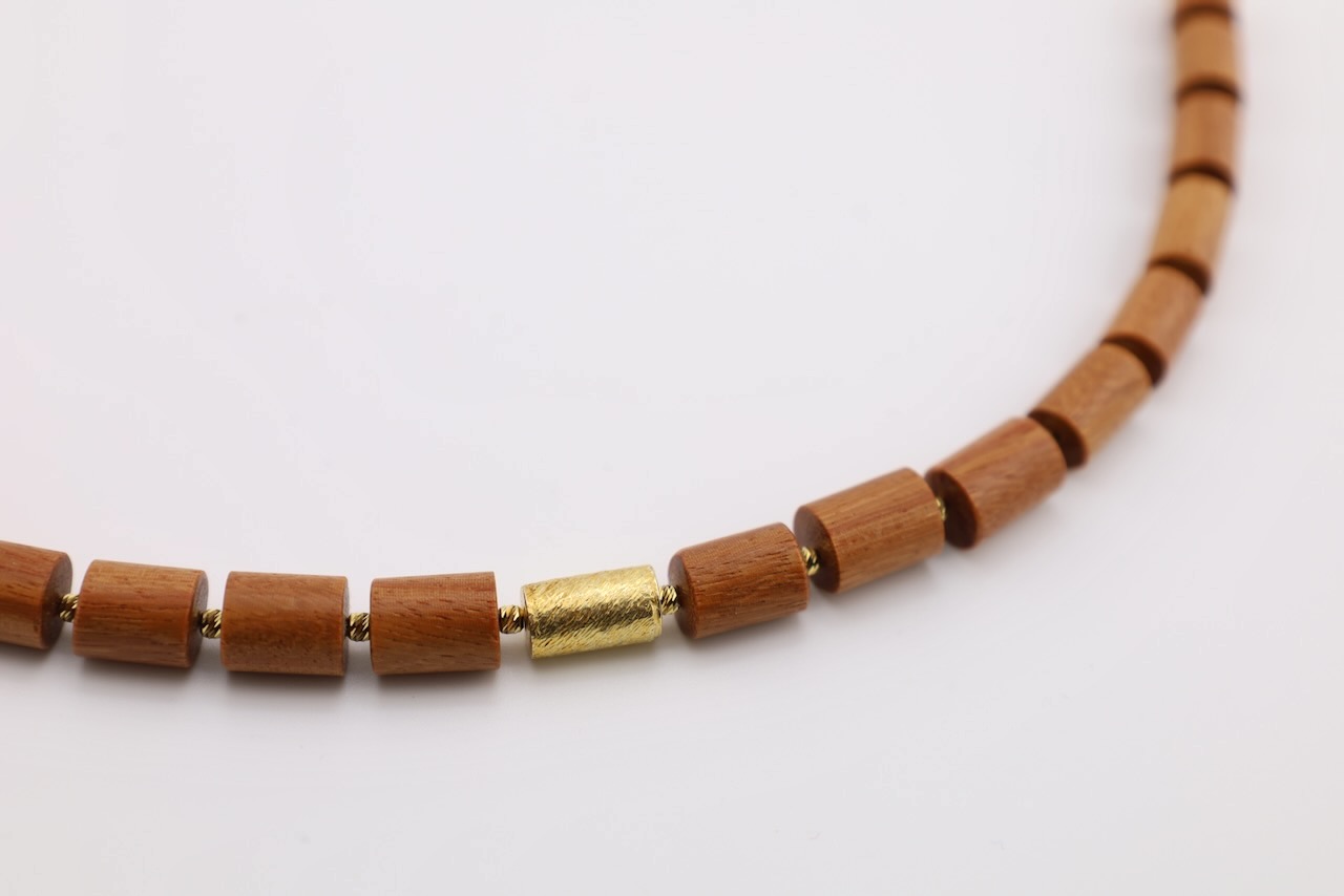 Zwischen den Holzelementen setzen feine Goldelemente stilvolle Akzente. Der warme Goldton harmoniert perfekt mit den natürlichen Farben des Holzes und verleiht der Kette eine elegante und zugleich zeitlose Ausstrahlung.