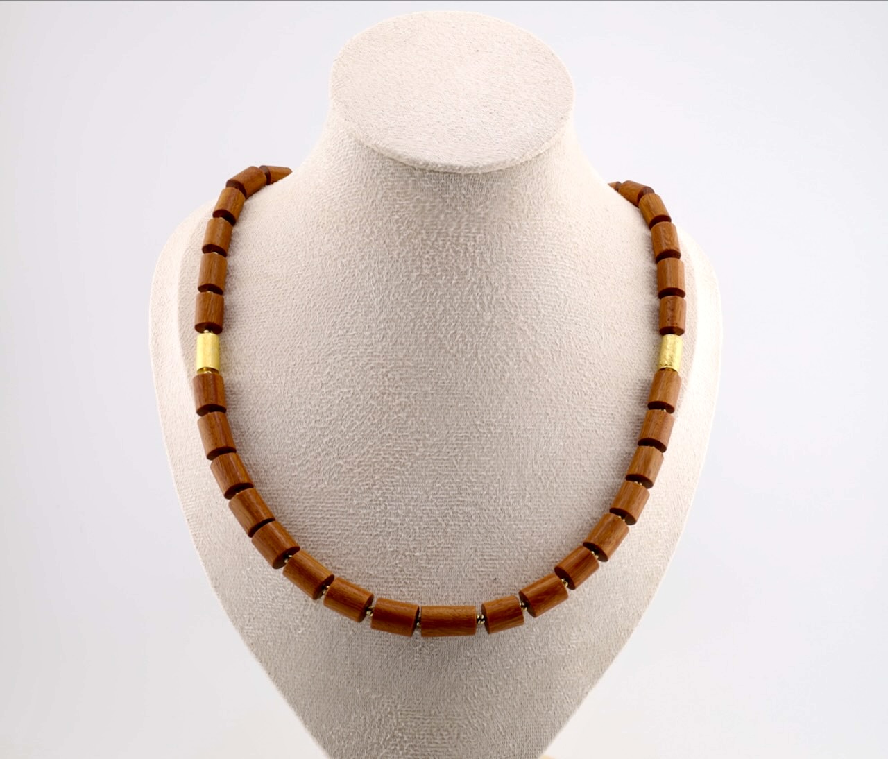 Diese handgefertigte Kette verbindet die warme, natürliche Ausstrahlung von Pau-Rosa-Holz mit eleganten Goldelementen. Das Zusammenspiel aus edlem Naturmaterial und glänzenden Metallakzenten verleiht dem Schmuckstück eine besondere Balance zwischen Natürlichkeit und klassischer Eleganz.