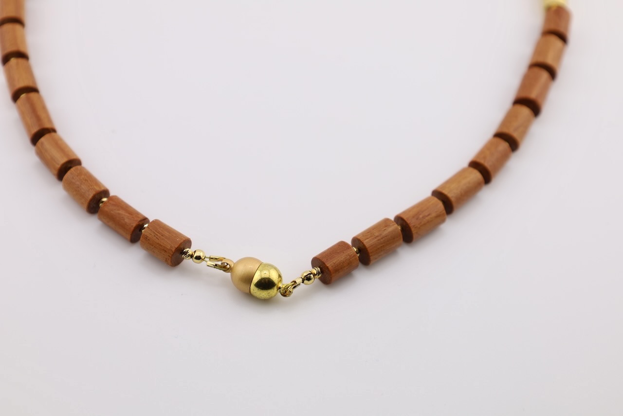 Handgefertigte Kette aus Pau Rosa und Goldakzenten