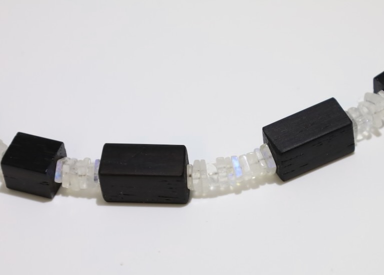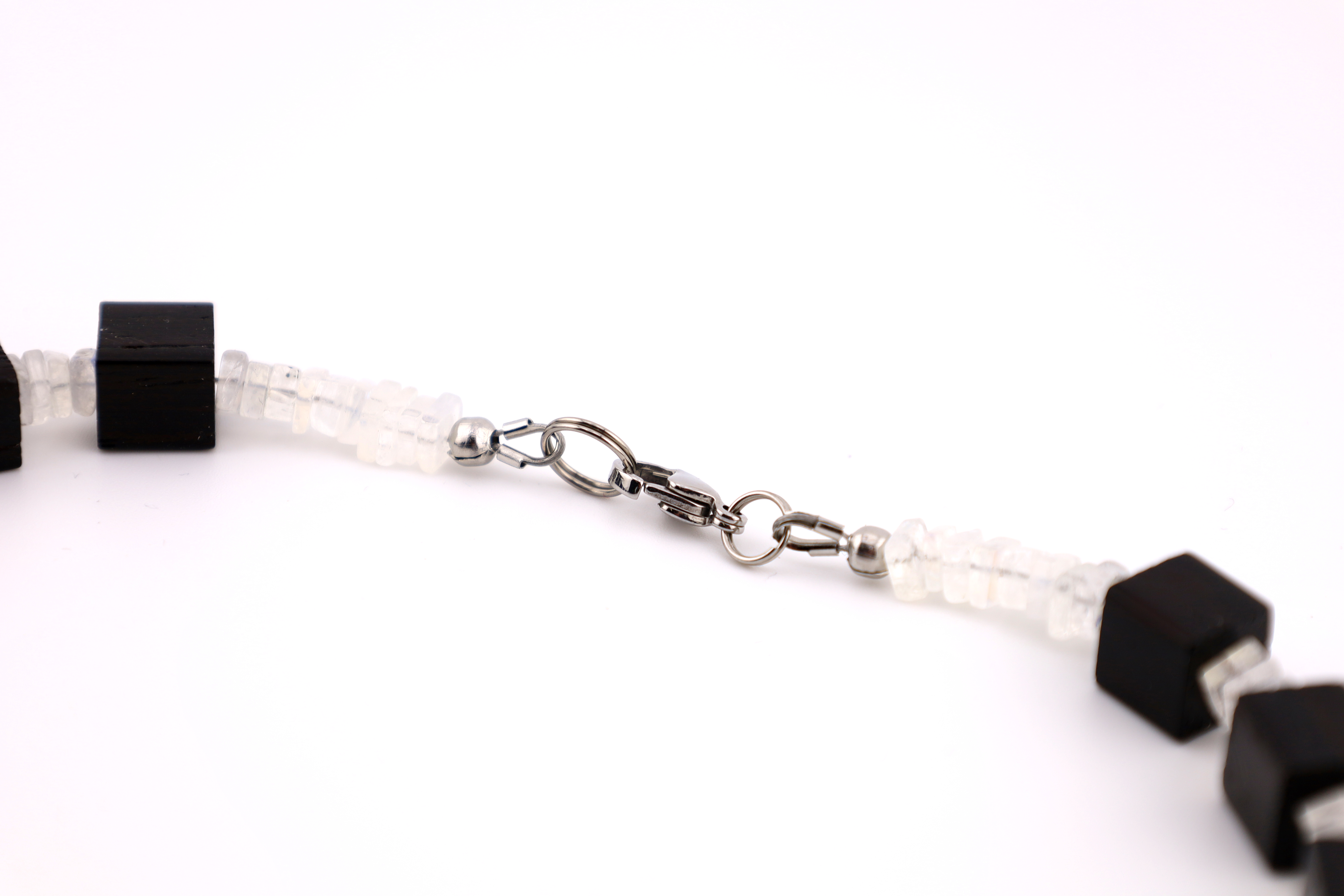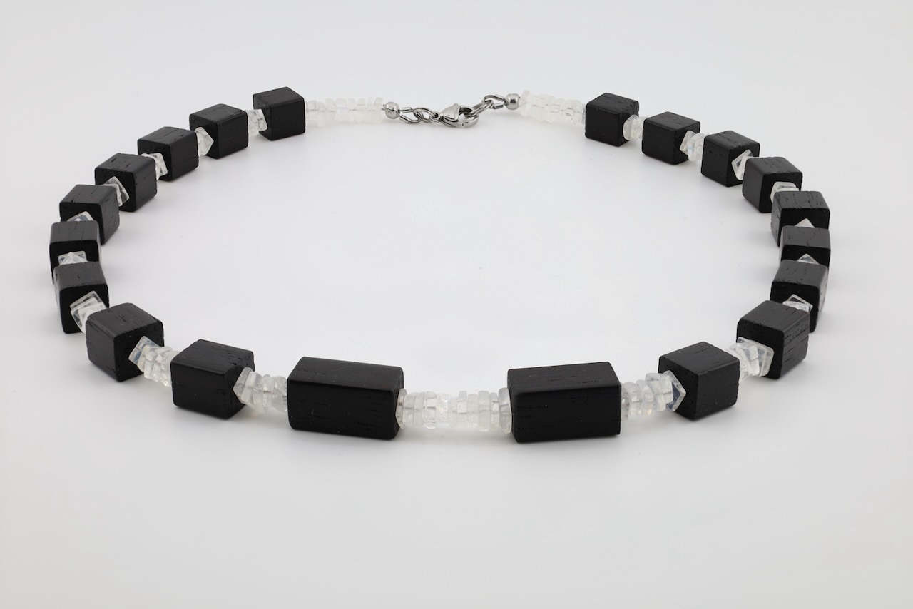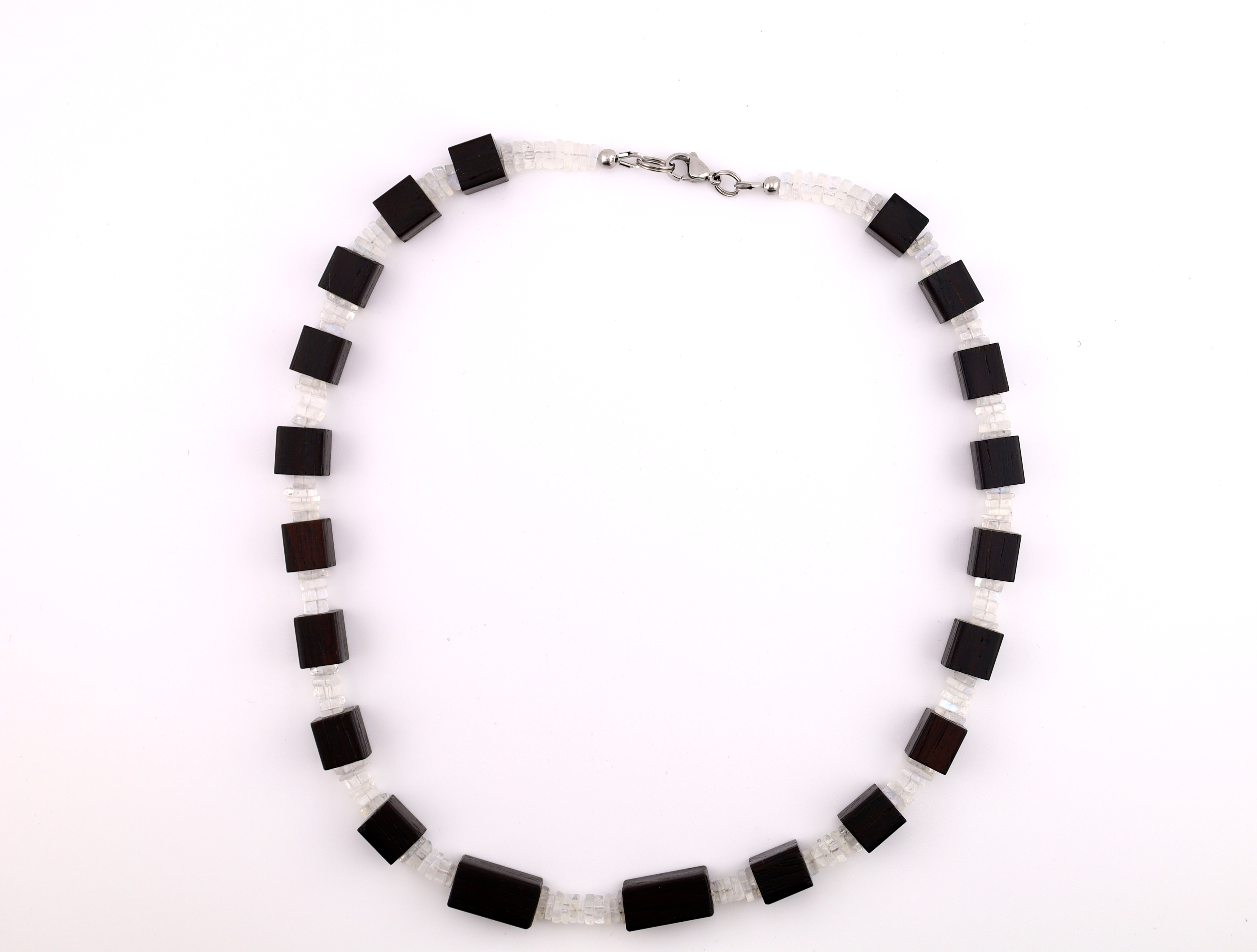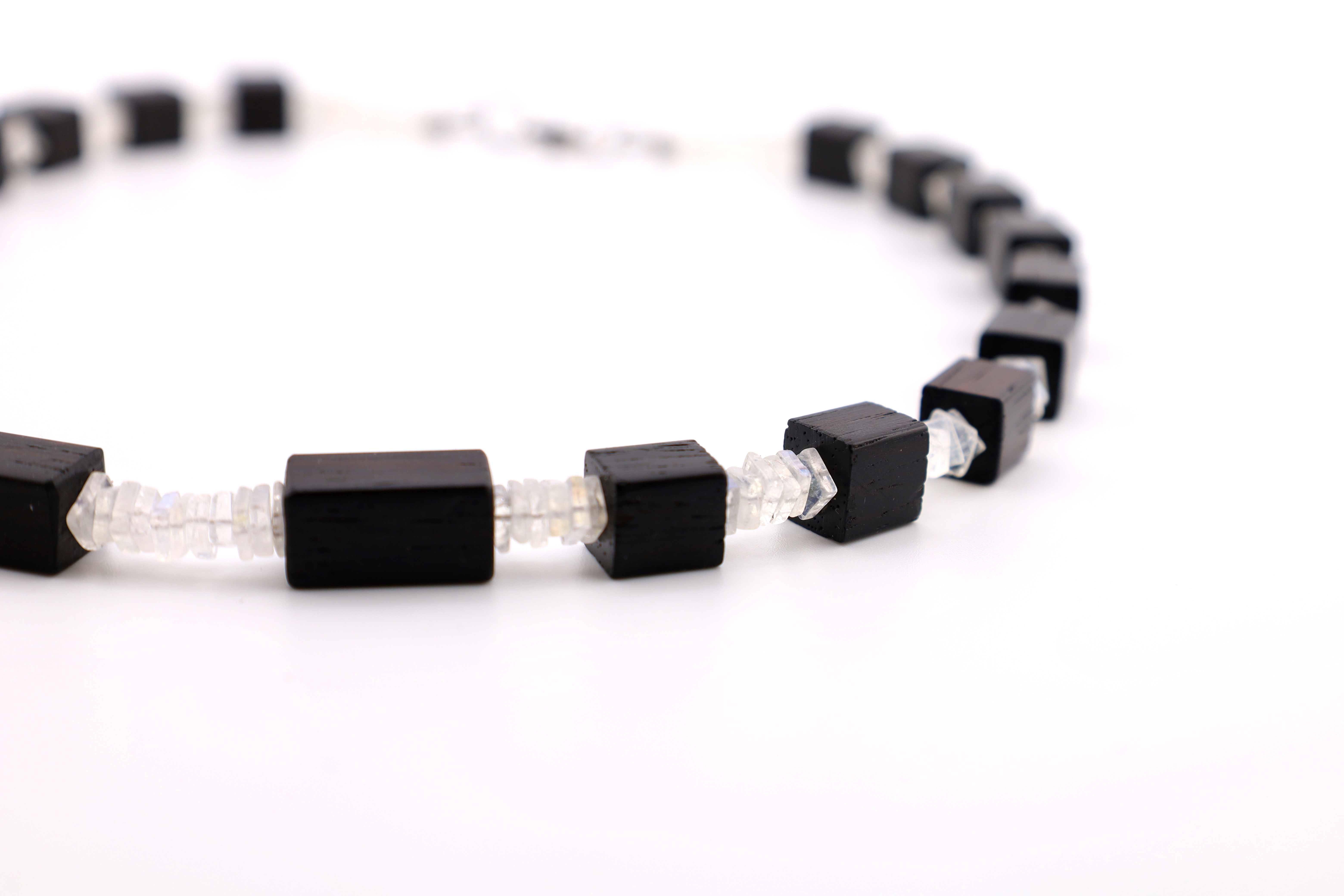 Die Würfelkette aus Grenadil und Regenbogenmondstein verbindet hochwertige Naturmaterialien mit sorgfältiger Handwerkskunst. Das Zusammenspiel aus dunklem Holz und dem irisierenden Schimmer der Edelsteine verleiht dem Schmuckstück eine besondere Ausstrahlung – dezent, elegant und natürlich zugleich.
