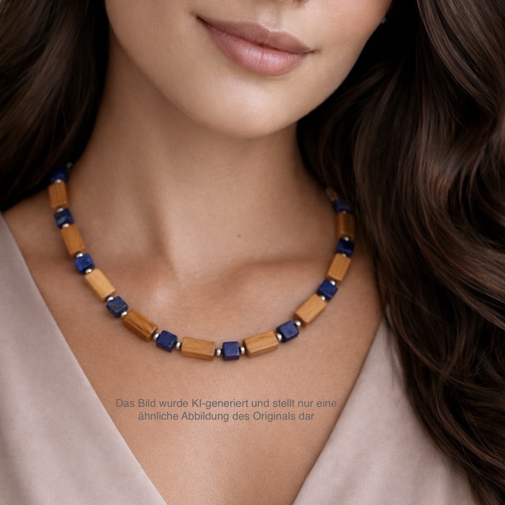 Diese handgefertigte Würfelkette verbindet die warme, lebendige Maserung von Olivenholz mit dem intensiven Blau des Lapislazuli. Die Kombination aus natürlichem Holz und edlem Edelstein schafft ein harmonisches Schmuckstück, das Natürlichkeit und Eleganz auf besondere Weise vereint.