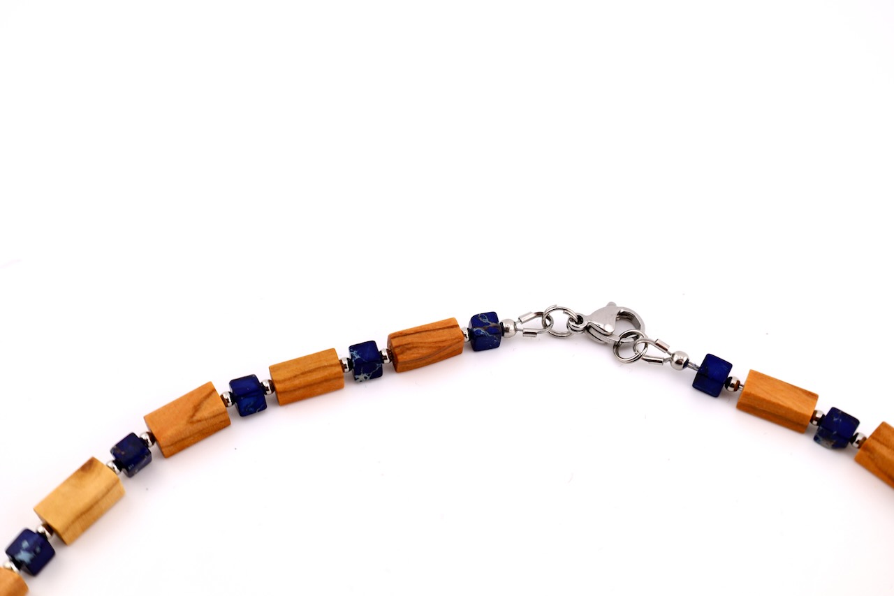 Handgefertigte Würfelkette aus Olivenholz und Lapislazuli