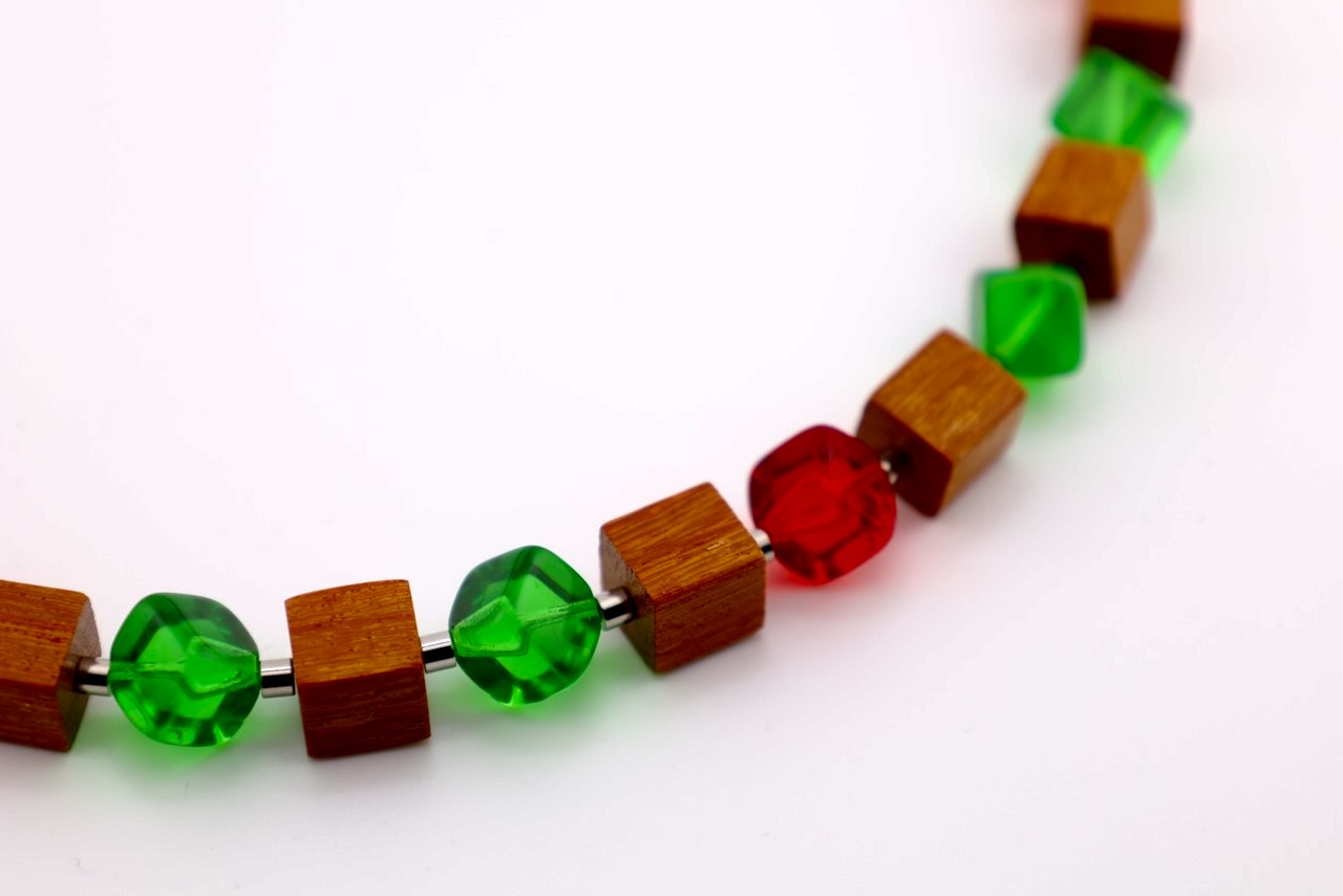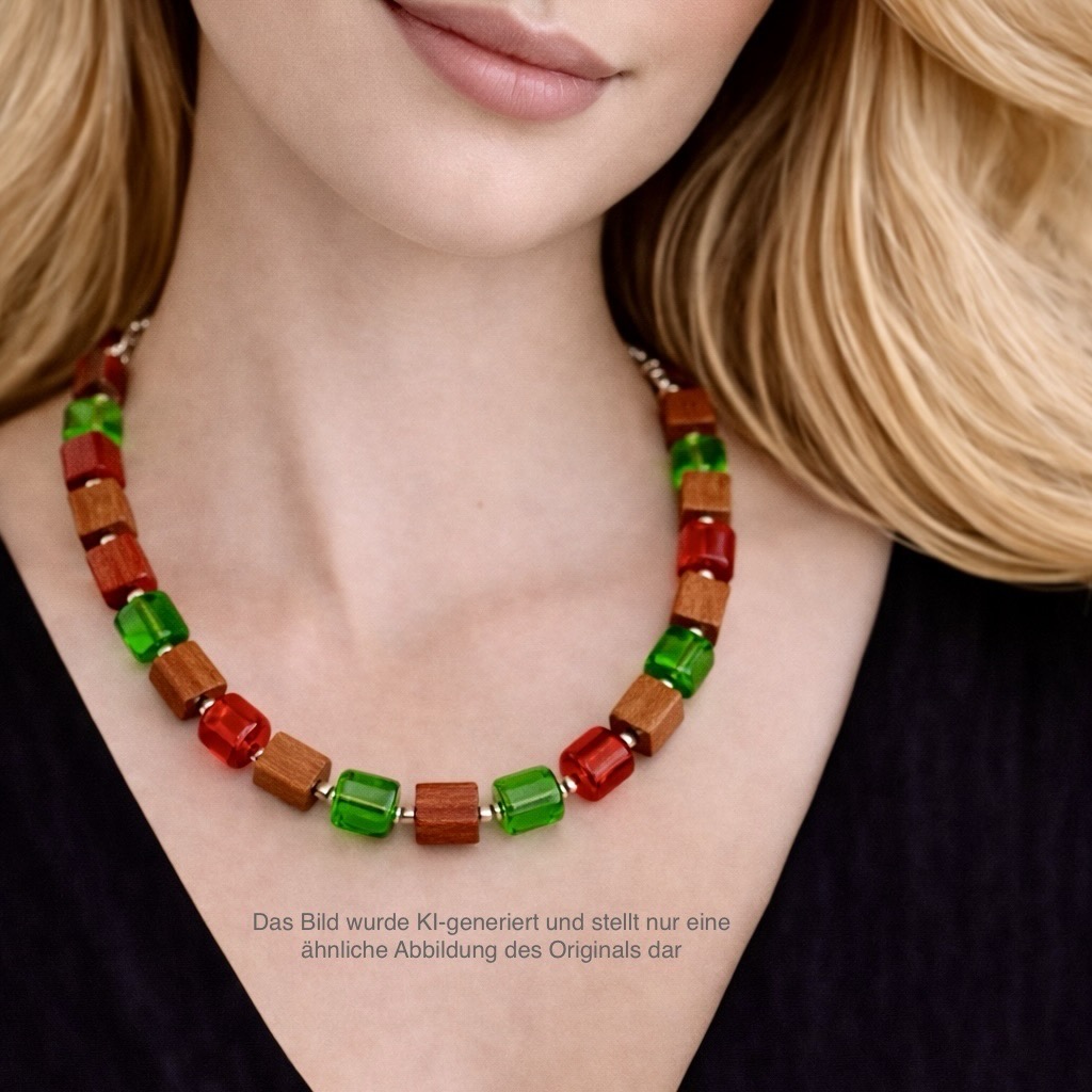 Zwischen den Holzwürfeln setzen böhmische Glasperlen in Rot und Grün lebendige Akzente. Diese Perlen stammen aus der traditionsreichen Glasregion Böhmen im heutigen Tschechien, die seit Jahrhunderten für hochwertige Glasherstellung und kunstvolle Schmuckperlen bekannt ist.