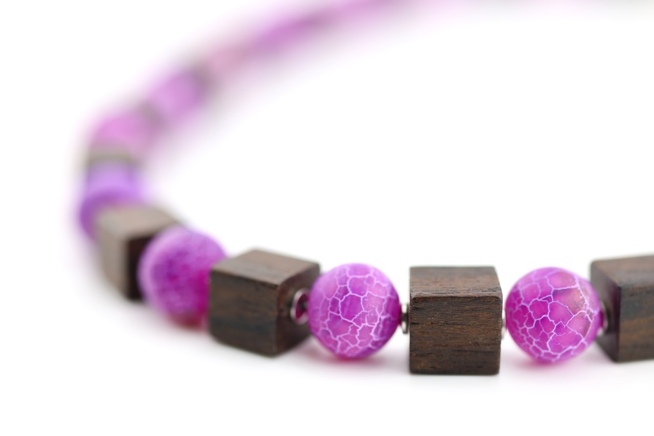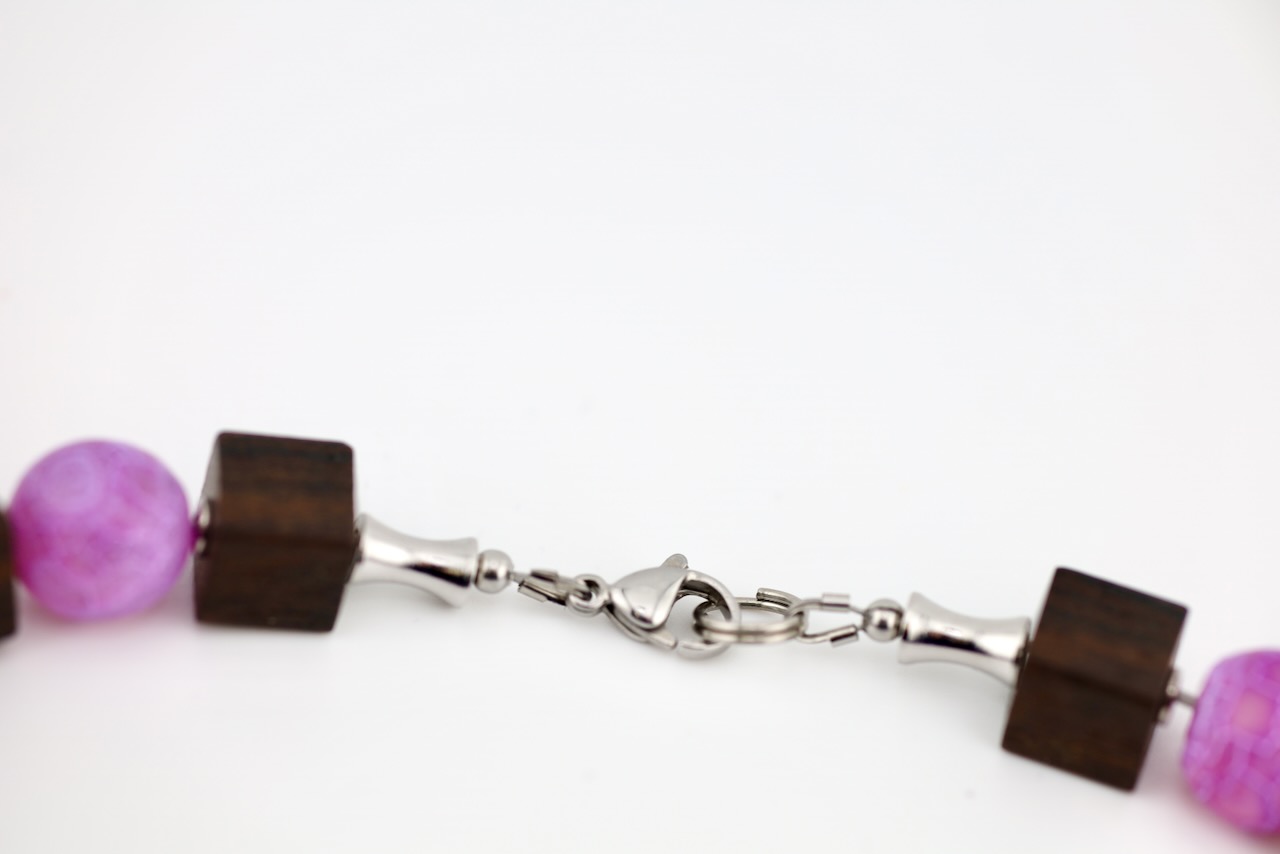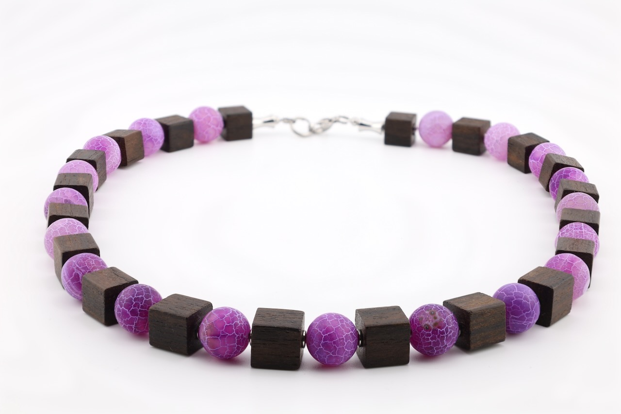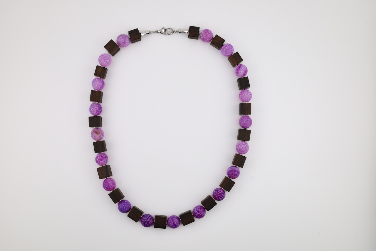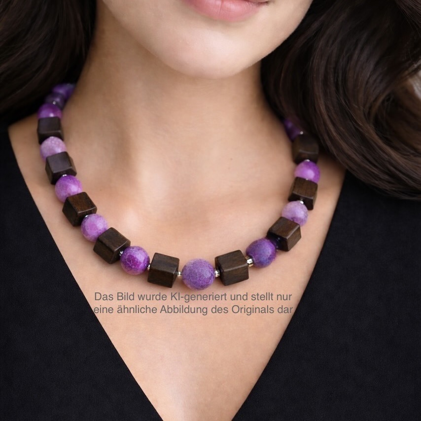 Zwischen den Holzwürfeln setzen lila Glasperlen stilvolle Akzente. Die intensive Farbe bildet einen harmonischen Kontrast zum dunklen Holz und verleiht der Kette eine moderne und elegante Ausstrahlung.