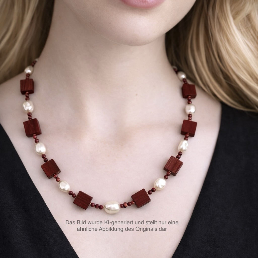 Diese handgefertigte Würfelkette verbindet die natürliche Schönheit von Amaranthholz mit dem sanften Schimmer echter Süßwasserperlen. Das Zusammenspiel der warmen Holzfarbe und der edlen Perlen schafft ein harmonisches Schmuckstück, das zeitlose Eleganz und natürliche Materialien vereint.