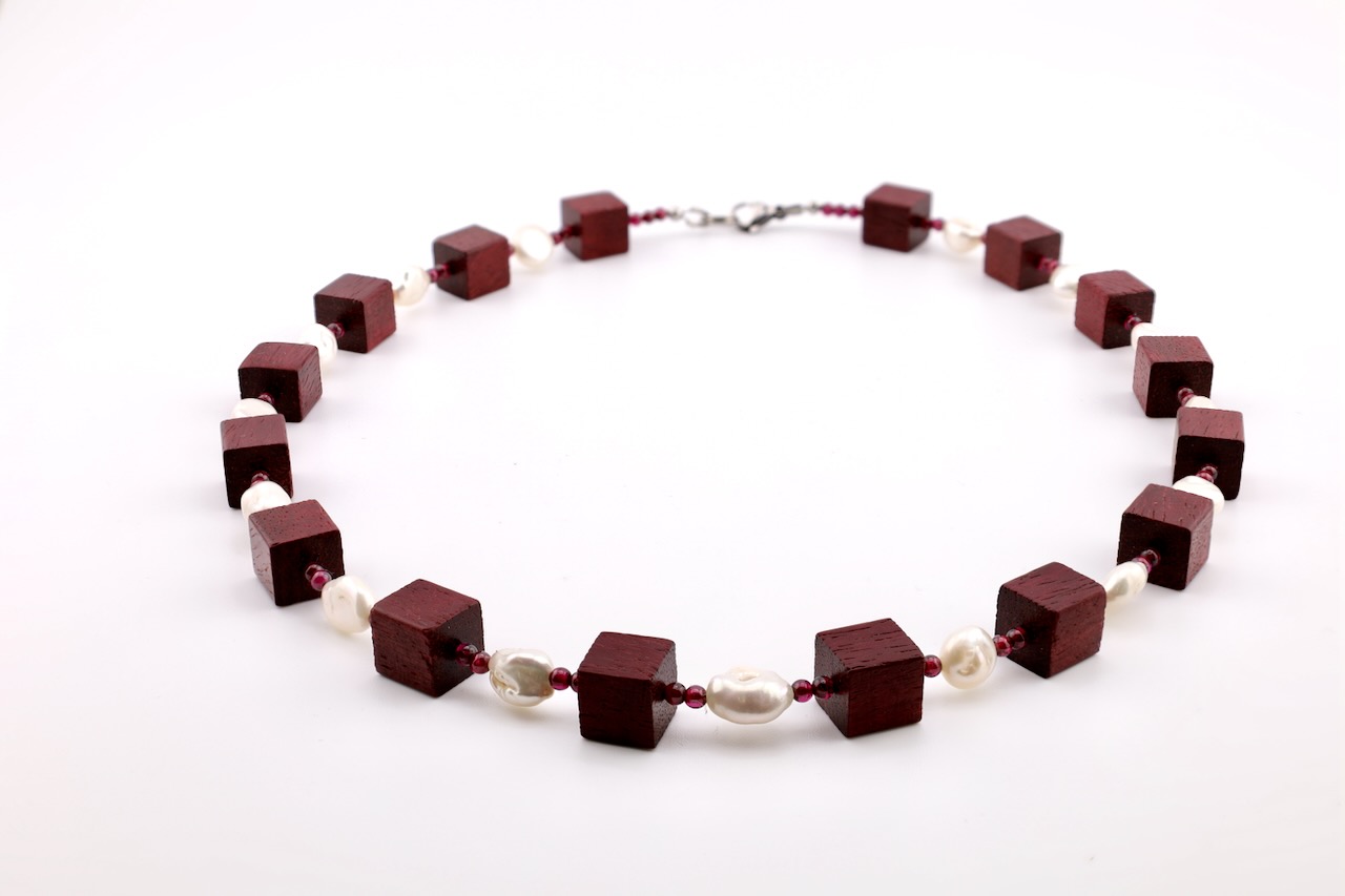 Die sorgfältig gearbeiteten Holzwürfel aus Amaranth – auch bekannt als Purpleheart – zeichnen sich durch ihre charakteristische violett-braune Farbgebung und ihre lebendige Maserung aus. Zwischen den Holzelementen sorgen schimmernde Süßwasserperlen für stilvolle Akzente und verleihen der Kette eine besondere Leichtigkeit und Eleganz.