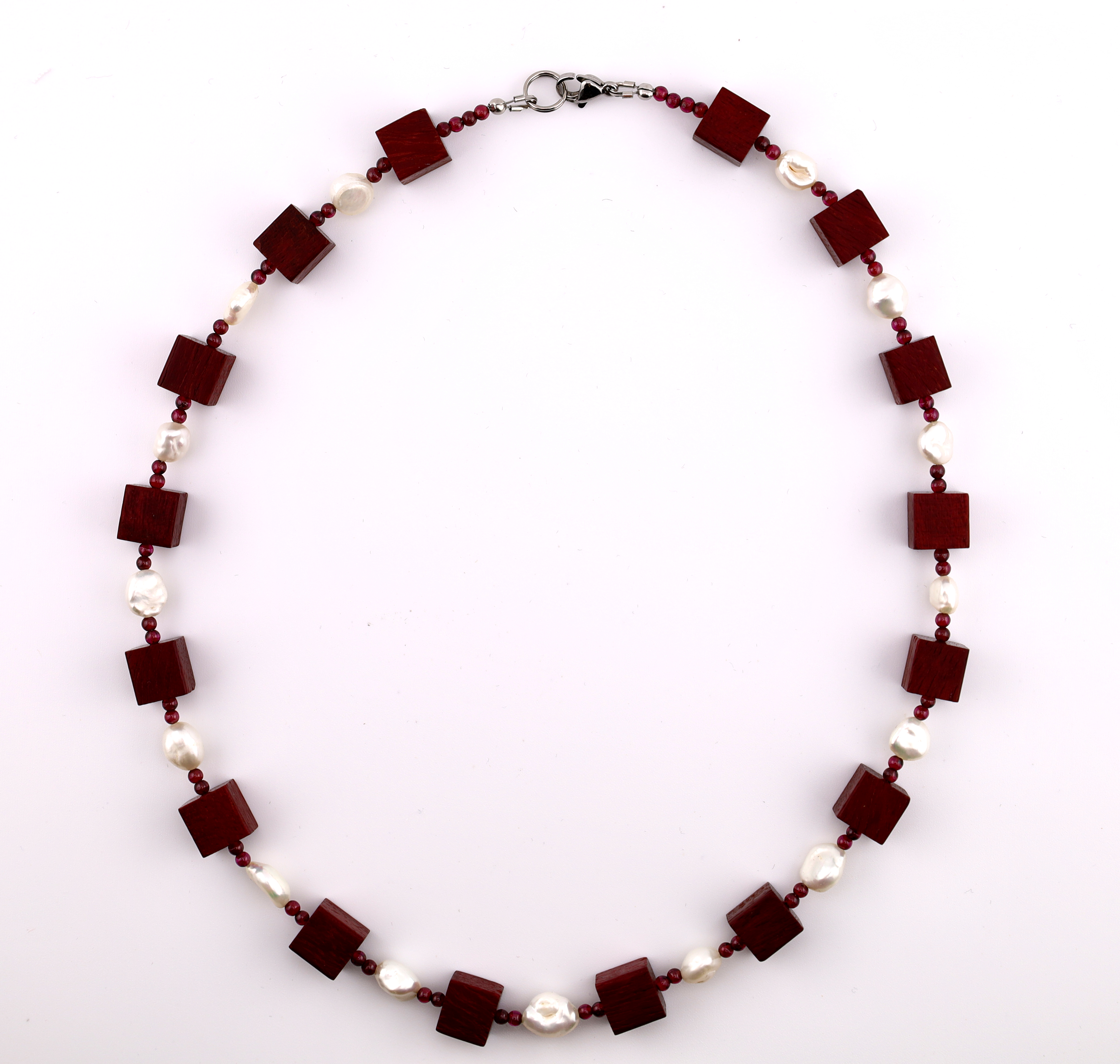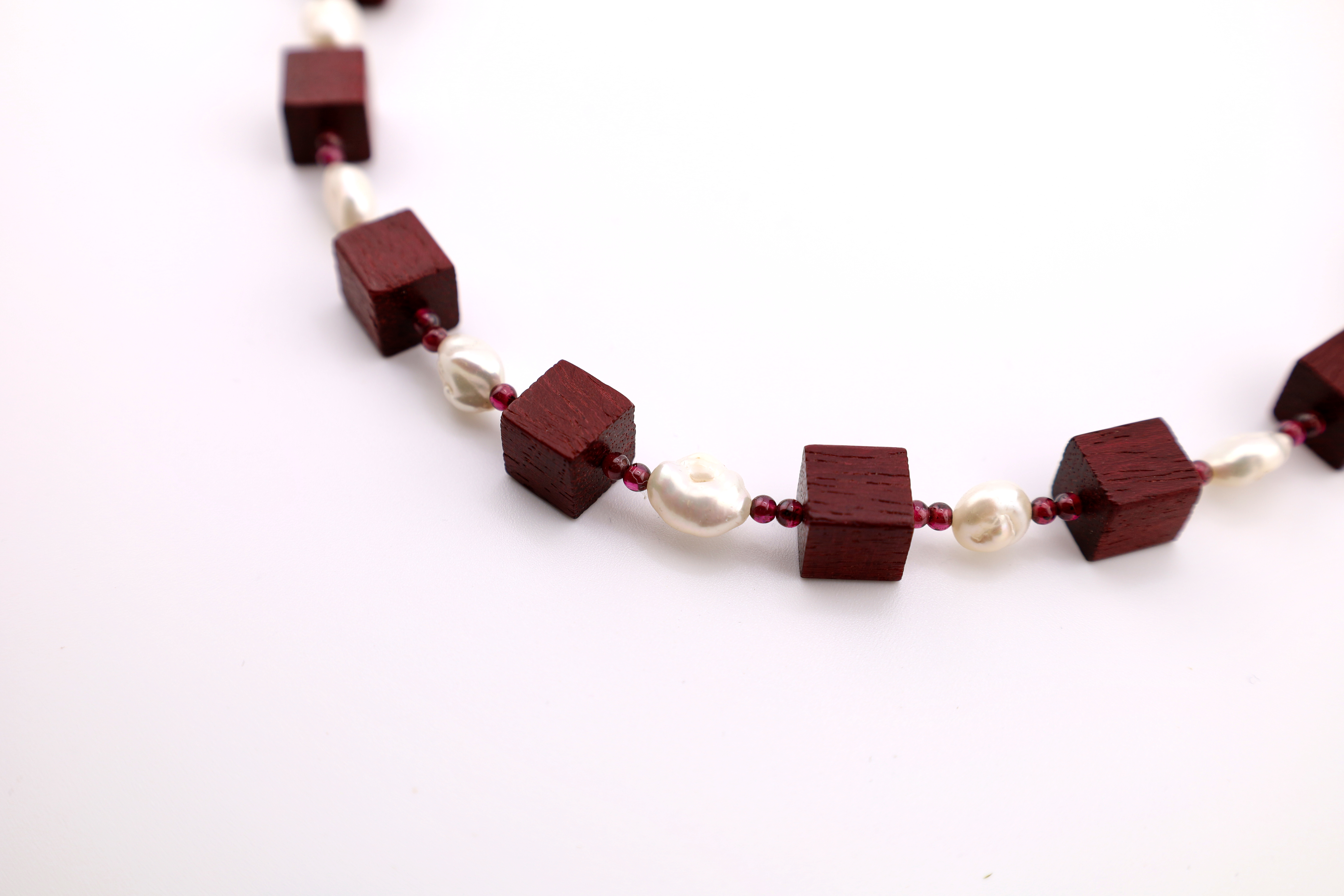 Handgemachte Würfelkette aus Amaranth, Granat- und Süßwasserperlen