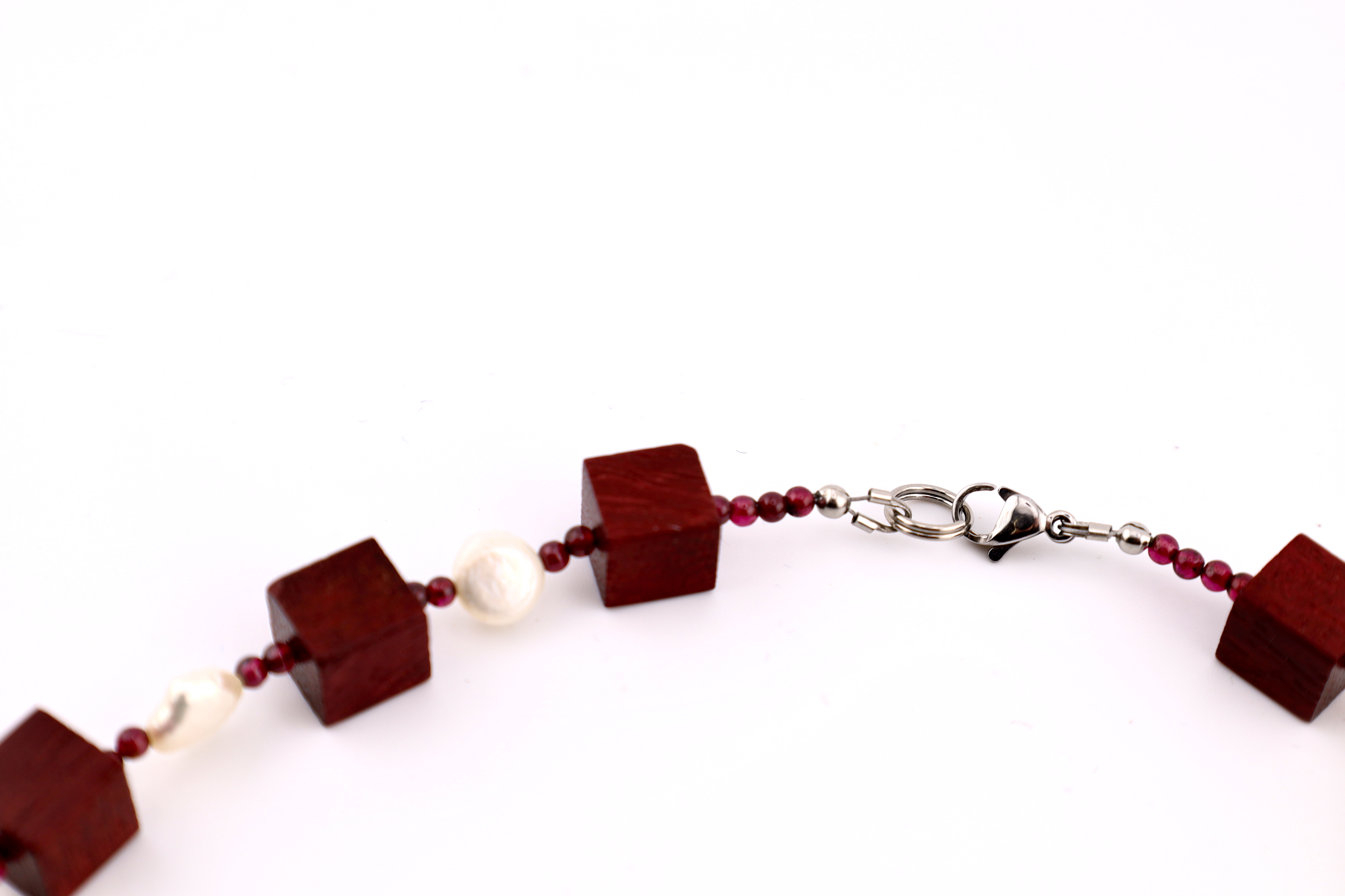 Die Würfelkette aus Amaranth, Granat- und Süßwasserperlen steht für nachhaltige Materialien, sorgfältige Handarbeit und zeitloses Design. Sie verbindet natürliche Ästhetik mit hochwertiger Verarbeitung und ist damit ein Schmuckstück, das lange Freude bereitet.