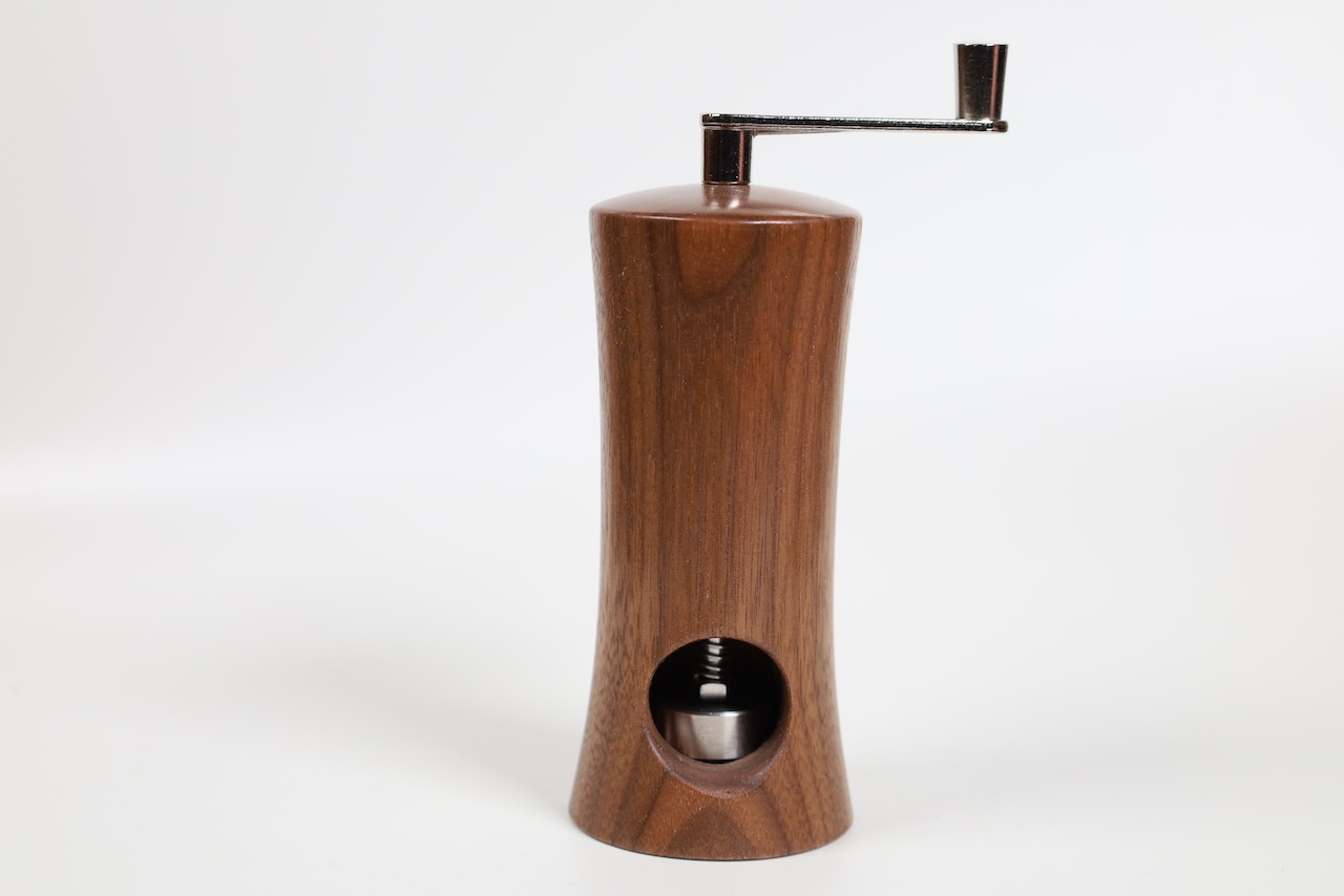 Das Präzisionsmahlwerk stammt von der Schweizer Firma Strässler und ist sehr langlebig. Das Mahlwerk ist extrem leichtgängig, also Vorsicht bei der Dosierung. Zum Nachfüllen der Mühle einfach die Kurbel nach oben ziehen und eine neue Nuss in das Loch setzen.