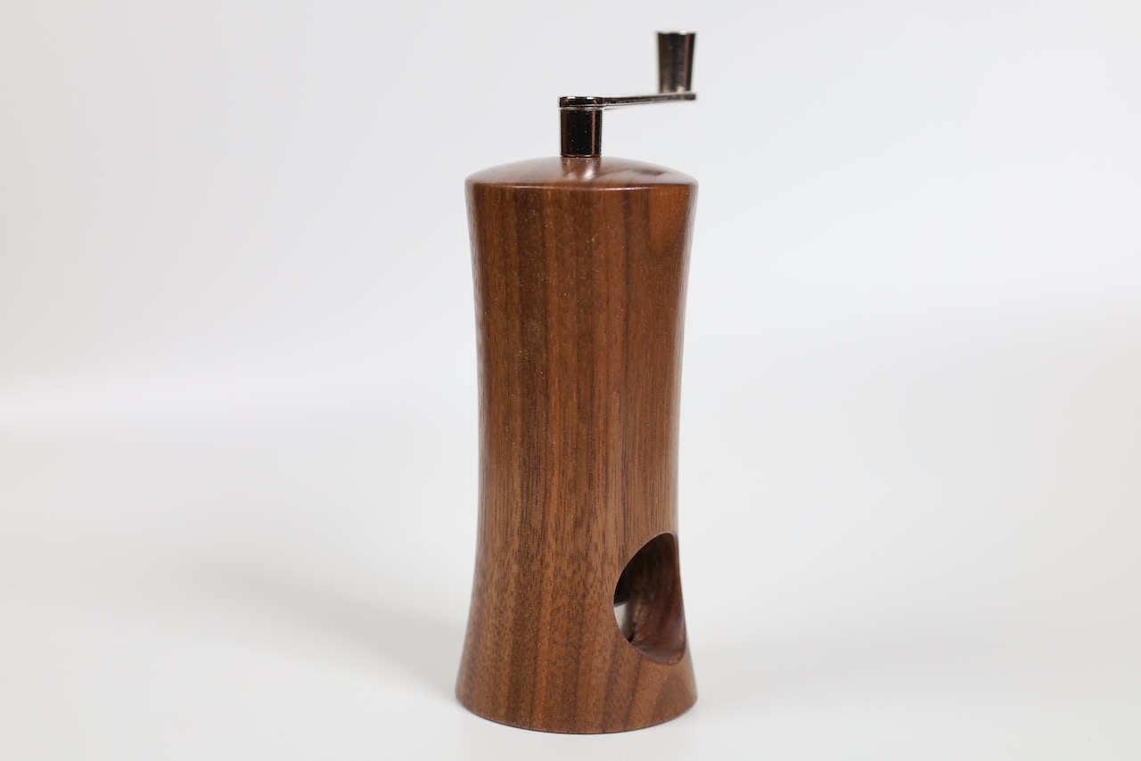 gedrechselt aus Walnussbaumholz, taillierte Form mit schöner Maserung. Das Präzisionsmahlwerk stammt aus Schweizer Produktion.