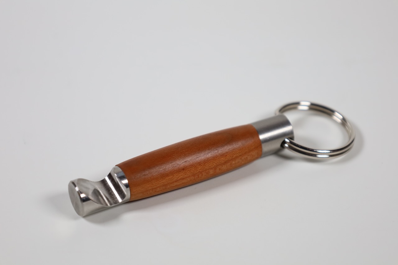 Schlüsselanhänger mit Flaschenöffner aus Zwetschgenbaumholz und Edelstahl.
